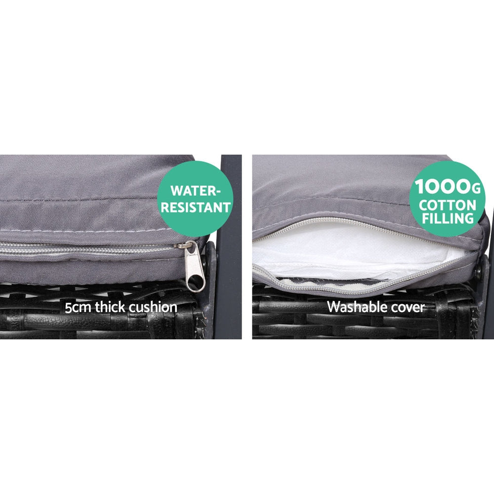 Great for any balcony or patio area, our 4-pc Outdoor Set simply looks inviting and elegant from any angle. From its sturdy powder-coated frame and UV-resistant PE wicker to the ultra-comfortable 1000g cotton-filled 5cm thickness cushions and 5mm tempered glass table top, the set is simply finished in extraordinary workmanship. The cushion covers are almost removable and washable for easy maintenance. Best of all, you need not use it just for the outdoors, as this marvellous set is just as appealing in your living room, bedroom or any room that deserves its fine presence.