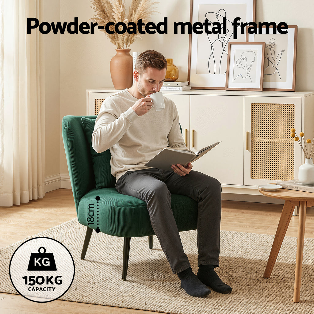 Bring a fresh and inviting atmosphere to your home with this elegant accent armchair. Crafted for supreme comfort and timeless style, it is an ideal addition to any living space, bedroom, or office. The lush green corduroy velvet upholstery combined with a sturdy metal frame offers both luxury and durability for everyday use.