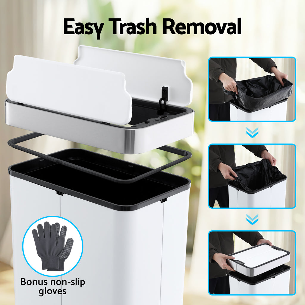 Hands-free sensor bin opens automatically at 15–25 cm for touch-free use.