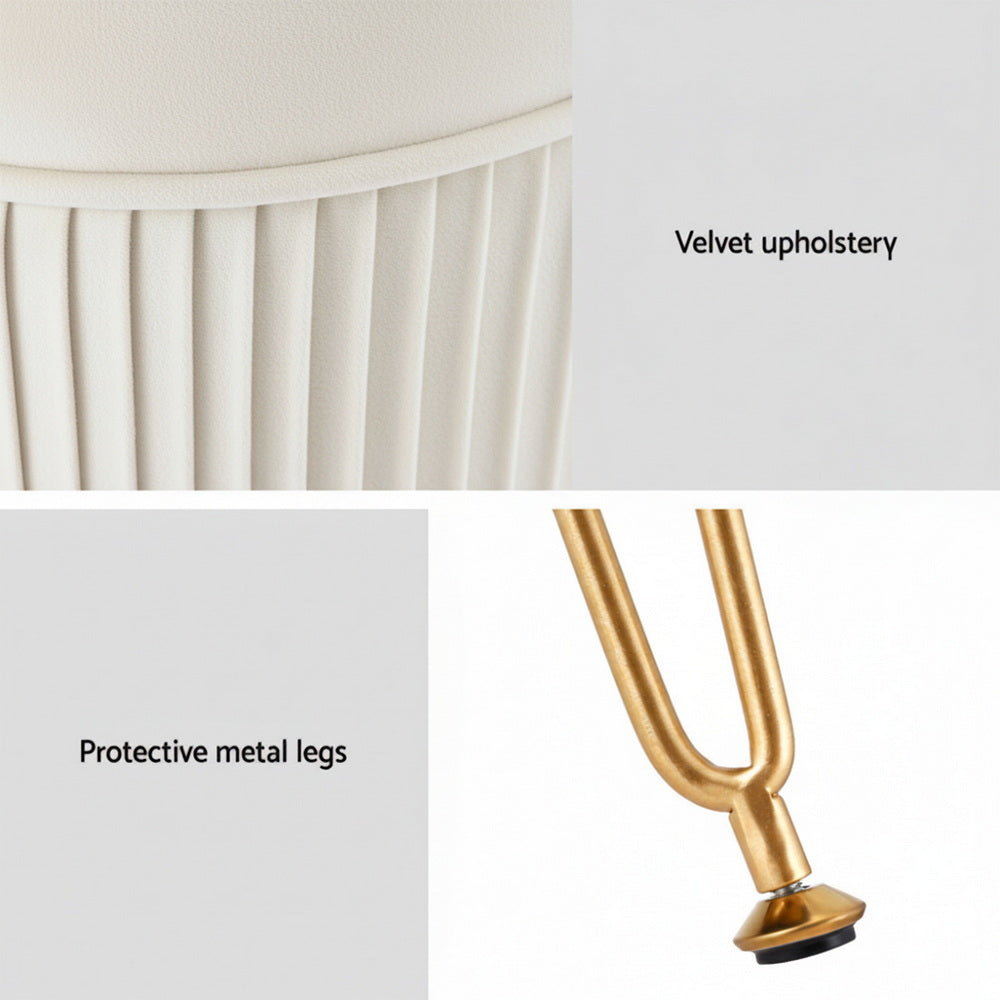 Round velvet footstool with vertical stripe design, durable MDF frame, and high-resilience foam padding. Features protective metal legs and simple assembly.